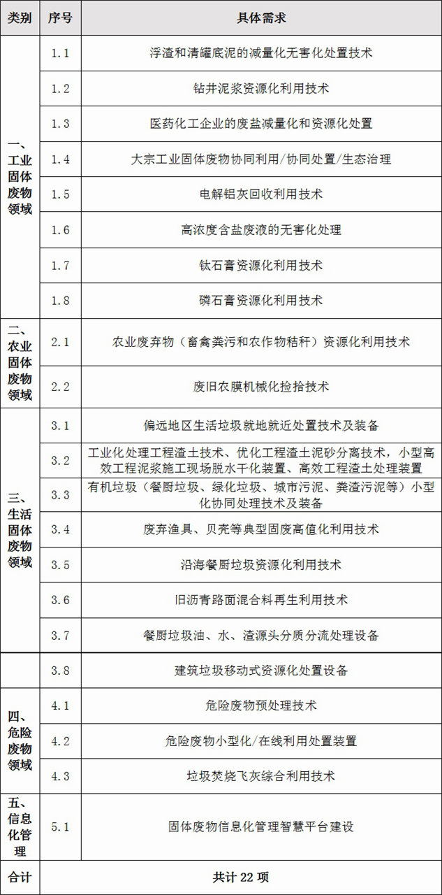 “无废城市”试点建设技术需求清单如下: