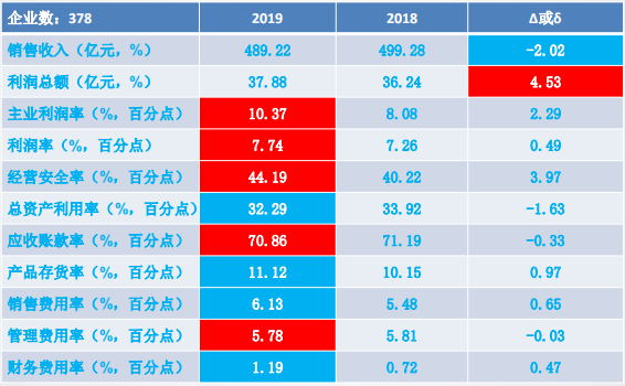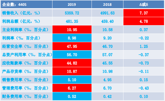 实现主营业务收入5359.72亿元,同比增长7.37%、 比上年下降1.70个百分点。 净增368.09亿元,比上年的492.38亿元减少25.24%。企业主营业务收入平均规模12167万元,同比增加836万元。