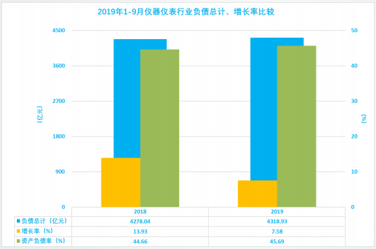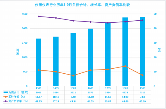 2.10 仪器仪表行业历年1-9月负债合计、增长率、资产负债率比较